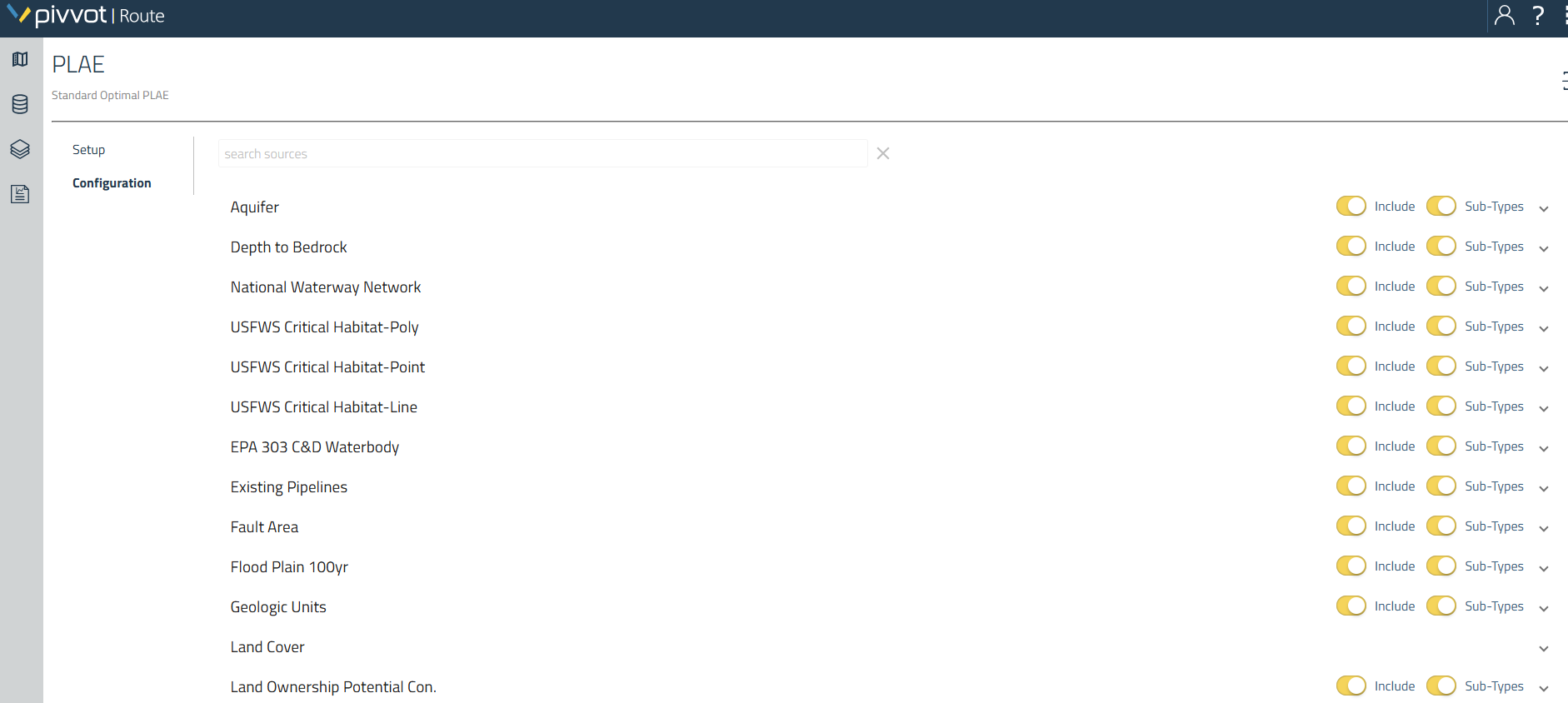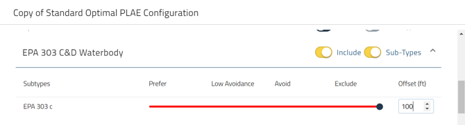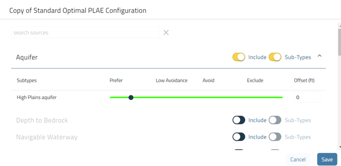 The PLAE Configuration screen will show you the datasets that occur within your AOI. To include a dataset, toggle the include setting. To get more detailed in setting your preferences, slide the Sub-Types slider from left to right to show the data sub-types that appear in your AOI and set your preference level.