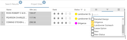 You can limit your project sites by status by selecting the status of the sites you would like to see in the list of project sites and on the map. Hover over the top of the status column, click on the hamburger icon and then the filter icon. Check or uncheck the status checkboxes to customize which sites appear on the map.