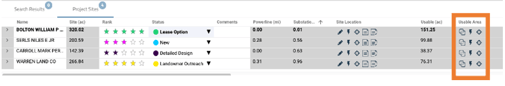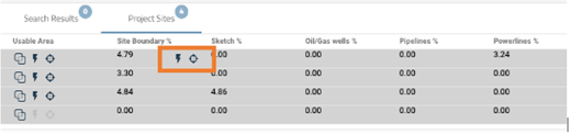 The usable area column contains three tools. From left to right, the first icon will calculate the usable area for the site, flash the usable area in the site, zoom to the usable area of the site on the map.