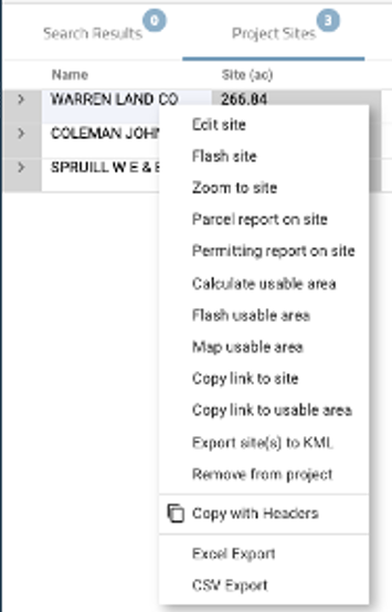 Right clicking on a record in the table, will open the options menu. This menu contains all record functionality as well as the option to export all project site information to Excel or CSV.